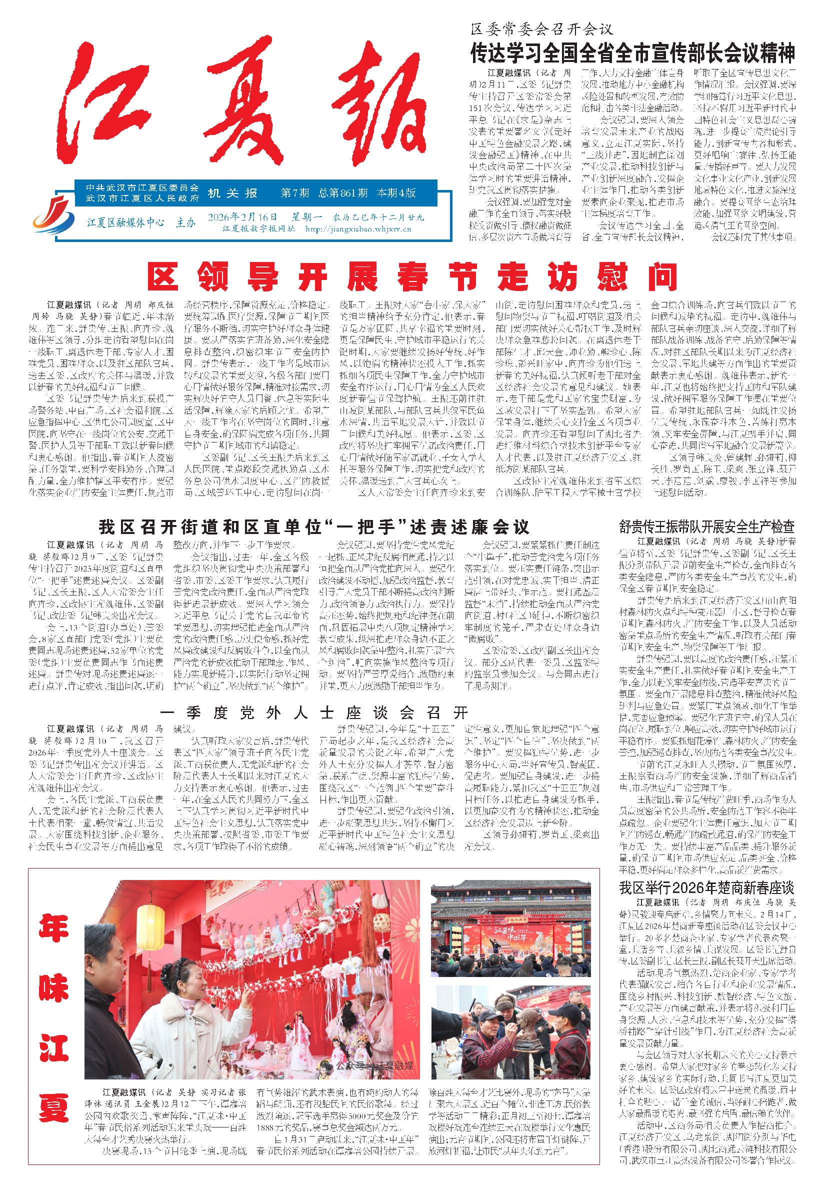 江夏融媒讯 (记者 周玥 马骁 蒋毅晖)2月10日,我区召开2026年一季度党外人士座谈会。区委书记舒贵传出席会议并讲话。区人大常委会主任向卉珍,区政协主席魏雄伟出席会议。会上,各民主党派、工商联负责人,无党派和新的社会阶层代表人士代表相聚一堂,畅叙情谊、共话发展。大家围绕科技创新、企业服务、社会民...