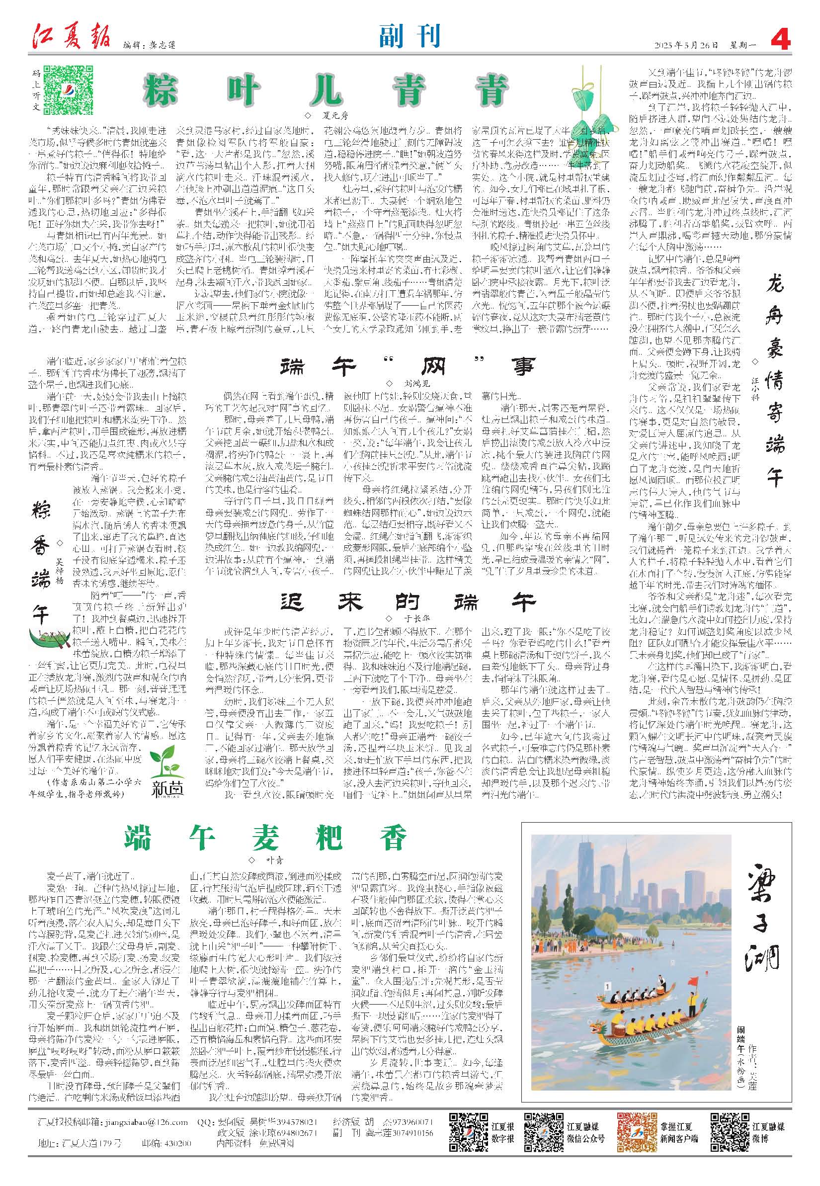 ◇ 汪小科又到端午佳节,“咚锵咚锵”的龙舟锣鼓声由远及近。我揣上几个刚出锅的粽子,踩着鼓点,兴冲冲地奔向江边。到了江岸,我将粽子轻轻抛入江中,随后挤进人群,望向不远处集结的龙舟。忽然,一声嘹亮的哨声划破长空,一艘艘龙舟如离弦之箭冲出赛道。“嘿嚯!嘿嚯!”船手们喊着响亮的号子,踩着鼓点,奋力划动船桨。...